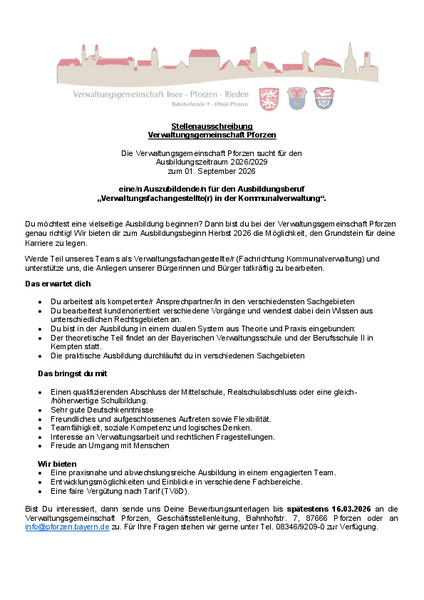 Unter folgendem Link bietet die Verwaltungsgemeinschaft Pforzen → www.vg-pforzen.de im Rahmen des „Bürgerservice-Portal“ → hier verschiedene Online-Fachdienste an.