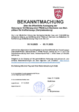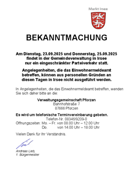 Am Di., 23.9. und Do., 25.9. in Irsee eingeschränkter Parteiverkehr. Angelegenheiten, die das Einwohnermeldeamt betreffen, können an diesen Tagen nur in Pforzen ausgeführt werden.