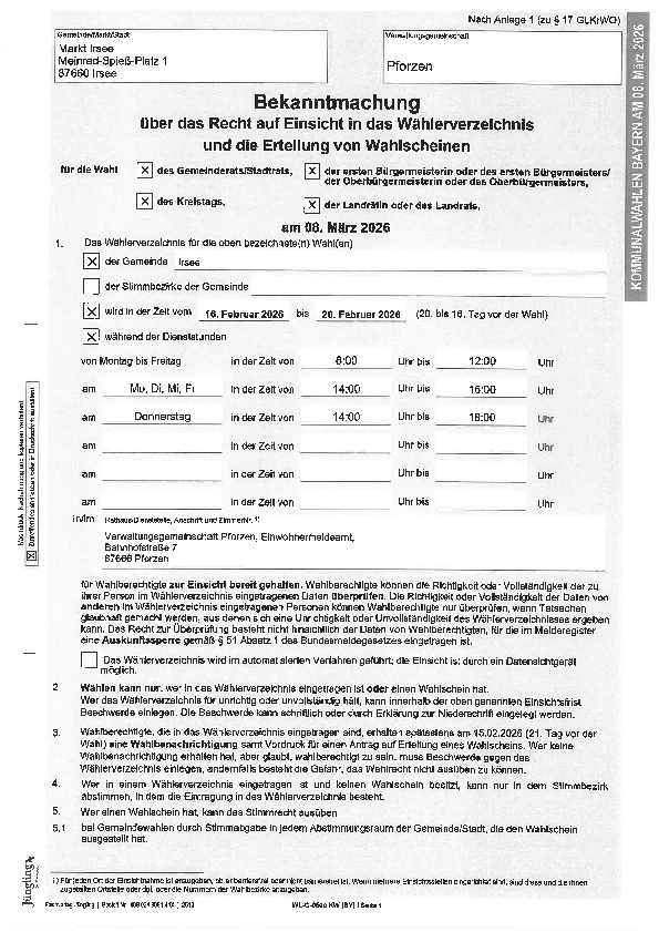 Die Beantragung eines Personalausweises oder eines Reisepasses (auch Kinderreisepass) ist aus technischen Gründen bislang nur in der Verwaltungsgemeinschaft Pforzen möglich. Laut Gesetz zur Preiserhöhung des Personalausweises vom 7.2.2026 kostet der Ausweis für Personen über 24 Jahre 46 €, für Personen unter 24 Jahre 27,60 €. Die Ausstellung der Ausweisdokumente kann derzeit fünf Wochen oder länger dauern. Bitte berücksichtigen Sie das bei Ihrer Reiseplanung.