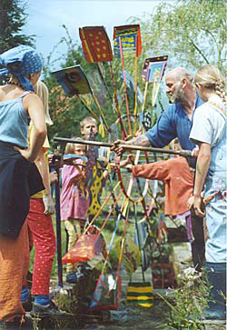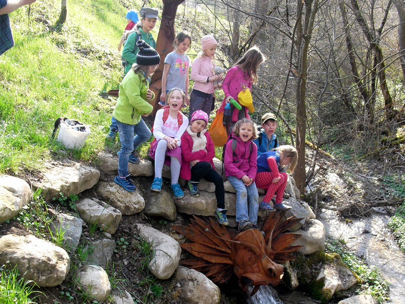 Lange Zeit war auch der Dorfplatz in Irsee von der "Schule der Phantasie" fantasievoll mitgestaltet. Es gab sogar einen "Skulpturenpark" mit glitzerndem Lehmthron unterm Baldachin, einem WindKlangSpiel, einem bulligen Schrottifant oder einem bunten Wasserrad, das noch heute durch den Dorfbach kreischt. Und während die einen Objekte vergehen, entstehen immer wieder neue – und für die Kinder ein Bezug zum öffentlichen Raum.