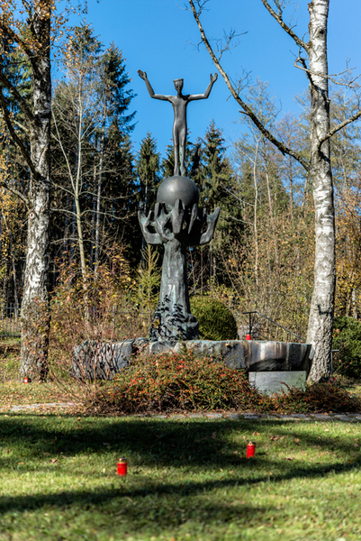 von Martin Wank auf dem Anstaltsfriedhof hinter der ehemaligen Klosterkirche. Eine abgeschnittene Baumkrone birgt die Weltkugel und der auferstandene Christus will die Menschen in der Gegenwart ermahnen, dass sie von der Vergangenheit in die Verantwortung genommen werden.