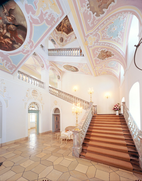 Öffnet der Besucher das Eingangsportal im Westen, bietet sich ihm sogleich der künstlerische Höhepunkt des einstigen Klosters dar, das Treppenhaus. Es liegt in dem zuletzt (1727–1729) errichteten Flügel, der ursprünglich die Privaträume des Abtes (Prälatur) und die Gästezimmer beherbergte. Die farbenfrohe Dekoration des drei Achsen breiten, nahezu quadratischen Treppenhauses entstand etwa zwischen 1729 und 1735. Als Schöpfer des unsignierten Deckengemäldes wird der Ottobeurer Maler Franz Anton Erler angesehen. Das Bild zeigt den »Triumph des hl. Benedikt«, der in einer monumentalen Scheinarchitektur, die Welt in einer Kugel schauend, dargestellt ist. Westlich darunter erscheinen die christlichen Tugenden, südlich stürzt Luzifer in den Abgrund, im Norden gehen die Laster zugrunde, und auf der Ostseite ist Chronos zu sehen. In den Eckkartuschen sind in Grisaillemalerei Allegorien der vier Kardinaltugenden wiedergegeben. In den Arkadenbögen des 1. und 2. Obergeschosses werden Landschaftsveduten von zarten Bandwerkfigurationen aus Stuck gerahmt. Auch die Flächen unter den Treppenläufen sind mit ovalen Gemälden und graziösen Stuckornamenten reich geschmückt.