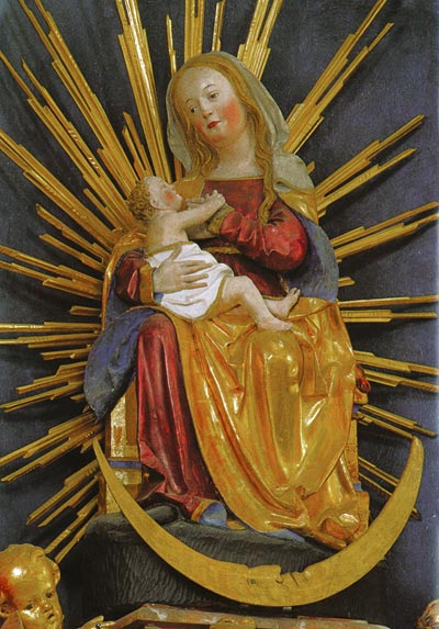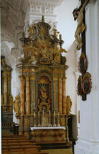 Von dem Gottvater-Bild nimmt nicht nur die Bildfolge der Deckengemälde ihren Ausgang, in diesem Gemälde findet zugleich das Bildthema des Hochaltars seinen Höhepunkt. Aufbau und Figuren des mächtigen Altars von 1722 sind das gemeinsame Werk des Schreiners Johann Bergmüller und des Bildhauers Ignaz Hillenbrand. Im Zentrum das 1722 datierte, von Fr. Magnus Remy gemalte, 8 x 3,40 m große Altarblatt mit Darstellung des Kirchenpatroziniums »Mariae Himmelfahrt«. Die themabedingte Höhenentwicklung der Komposition wird unterstrichen durch subtile Steigerung von irdischem zu himmlischem Licht und setzt sich über die bekrönende Heiliggeisttaube in der Glorie fort, bis in den Himmel des Gottvater-Bildes der Apsiskalotte.