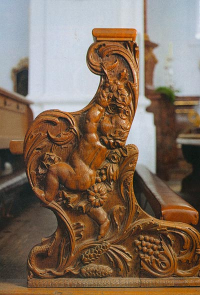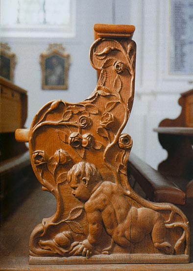 Beim Kirchengestühl sind vier Gruppen zu unterscheiden, die Reihen 1–4 (Nachbildungen des 19. Jahrhundert), 5–14 (um 1715), 15–21 (um 1705) und 22-24 (Nachbildungen des 20. Jahrhunderts). Für die im Original erhaltenen, geschnitzten Eichenholzwangen gibt es nichts vergleichbares; einzigartig ist die Vielfalt der kombinierten Motive: Putten – in Vorder-, Seiten- und Rückansicht, spielend, kletternd, sitzend und schlafend zwischen Draperien, Akanthus, Weinlaub, Frucht- und Blütengirlanden, manche essen Trauben. Keine der Szenen auf den 64 Wangen des Kernbestandes gleicht der anderen. Betrachtet man die Reihen 5–14 genauer, zeigt sich, dass die Farbe des Eichenholzes dunkler, die Formen schwerer und die Puttenkörper rundlicher sind als bei den jüngeren Teilen des Gestühls.