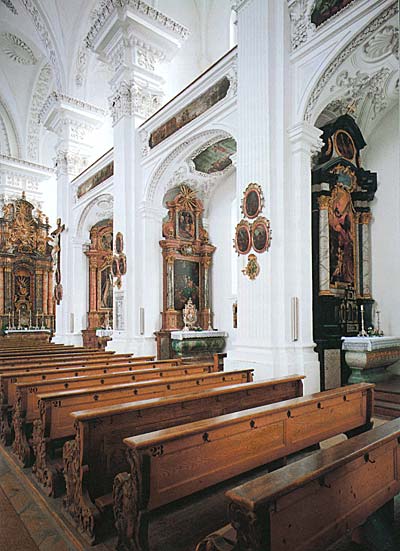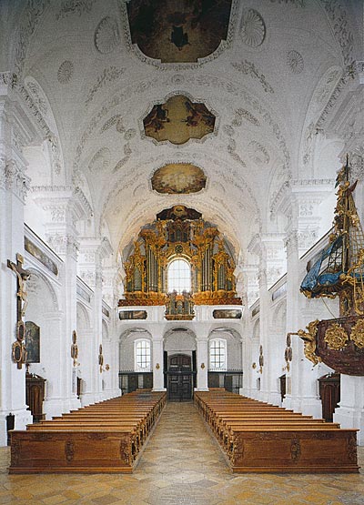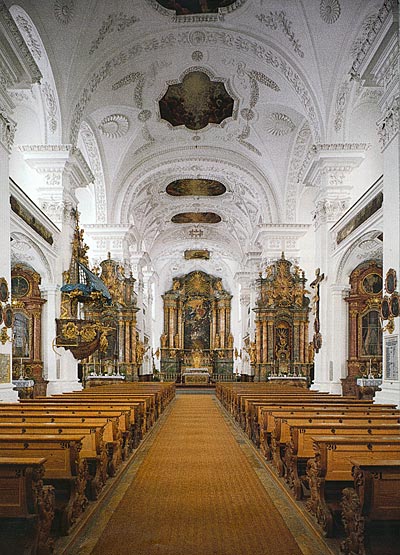 Bestimmend für den Aufbau ist die durchgehende Einteilung in zwei Geschosse (die Zwischenböden im Chor wurden erst 1725 eingebaut). Für die ausgewogene Erscheinung beider Raumteile sorgt das Gleichmaß von Horizontale und Vertikale: einerseits umlaufende Galerien (im Eingangsjoch zur Orgelempore verbreitert, in den Querarmen auf Gänge reduziert) mit geraden Brüstungen, andererseits die hohen, dreiseitig mit Pilastern besetzten Pfeiler; sie sind zwar Bestandteil der Zungenwände, die die Abseiten (mit Quertonnen) unterteilen, wirken aber durch ihre Gliederung und das stark ausgebildete Gebälk freigestellt. Dieser Eindruck kommt im Chor, wo die Abseiten aus liturgischen Gründen zugesetzt sind, weniger zur Geltung als im Langhaus. Die strenge Ordnung der Bauglieder ist nur einmal unterbrochen, und zwar im Bereich der Orgelempore; ihre vorspringende, auf Konsolen ruhende, geschwungene Brüstung dürfte eine Folge der Veränderungen von 1752–1754 sein, als die jetzige Orgel eingebaut und das Chorgestühl vom Hochaltarraum auf die Westempore verlegt wurde.