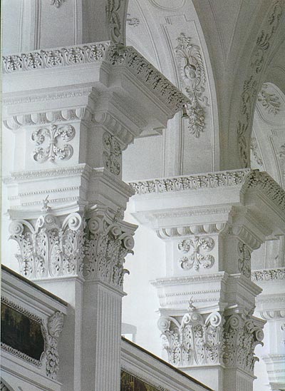 Die Kapitelle auf den kannelierten Pilastern sind in der Form der damals bevorzugten ionische und korinthische Elemente kombinierende Kompositordnung gestaltet. Vater und Söhne Schmuzer verwendeten diese Kapitellform ein halbes Jahrhundert ohne nennenswerte Änderungen. Da Kapitelle aus vorgefertigten Einzelteilen zusammengesetzt werden, ist es nicht verwunderlich, daß sie sich beispielsweise die Kapitelle in Irsee und Rheinau (ab 1708 von Franz Schmuzer stuckiert) vollkommen gleichen, denn Blätter, Voluten etc. wurden in denselben Modeln gegossen. Weiß gefasst stehen die Stukkaturen auf weißem Grund. Damit wurde die Tradition von Obermarchtal und Friedrichshafen fortgesetzt: das Besondere liegt im Spiel von Licht und Schatten. In diesem klaren Weiß erhalten die Farben der beweglichen Ausstattung, vor allem Gold- und Silberfassungen, ungeahnte Strahlkraft.