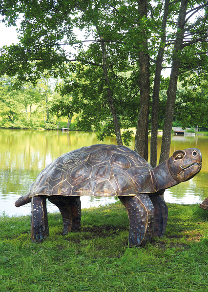 Zur Erinnerung an "Lotti", die bissige Schnappschildkröte aus dem Oggenrieder Weiher, wurde im Juli 2021 eine Metallskulptur der Irseer Künster Roman Reitzer und Peter R. Müller mit Blasmusik und köstlichen Mini-Lottis aus der Bäckerei Koneberg feierlich eingeweiht.