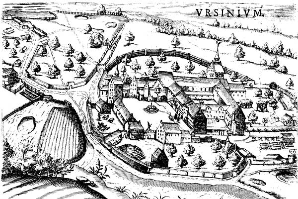 Die Edelherren von Ursin waren Schutzvögte des Klosters Ottobeuren. Um ihrem Kloster näher zu sein, verließen sie etwa um 1130 ihre Burg in Irsee und ließen sich in einer neuen Burg in Ronsberg nieder. In der Folgezeit wurde das Geschlecht sehr reich an Landbesitz und erhielt die Markgrafenwürde. Im weiteren Geschichtsverlauf wurde aus dem ursprünglichen Namen "Ursin" der Ort "Irsee". Die Geschichtsquellen zählen zahlreiche Abwandlungen der Ortsbezeichnung im Laufe der Zeit (Yrsinun, Ursina, Ursinum, Vrsinvn. Ursin, Versin, Yrsin, Yrsee, Irrsee, Irsee).